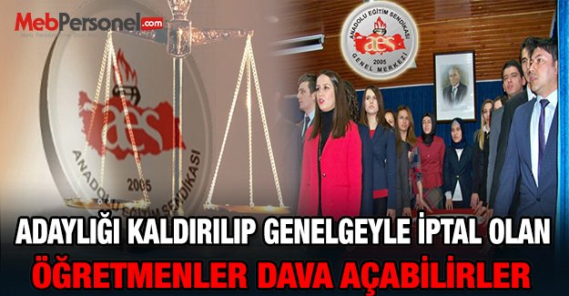 Adaylığı kaldırılmış olmasına rağmen 2015/13 sayılı genelgenin a-1 bendi gereği adaylık kaldırılma onay işlemi iptal edilen öğretmenlerin haklarının korunması adına bireysel davalar açılabilir. Sendika üyemiz olmayıp sendikamız hukuk servisimiz aracılığı ile dava açmak isteyen öğretmenlerin dava işlemlerine yardımcı olabilmemiz için bir konuyu hatırlatmak isterim. Sendikalar Kanuna göre ancak üyenin kendi adına dava açılması talebini içeren imzalı yetki formu ve onaylı üye formu eklenerek (ayrıca vekalet gerekmeksizin) sendika avukatları tarafından bireysel dava açılabilmektedir. Bu yüzden, dava açmak isteyen üyelerimiz sendika genel merkezimiz ile irtibata geçmesi gereğini bilgilerinize sunarız.
