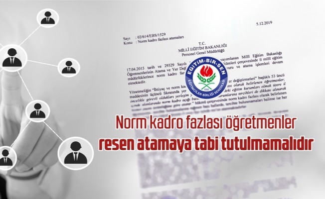 Eğitim-Bir-Sen olarak, Millî Eğitim Bakanlığı’na başvurarak, norm kadro fazlası olarak belirlenen öğretmenlerin atamalarının tercihleri esas alınarak yapılması; tercihlerine atanamayan veya tercihte bulunmayanların ise halen bulundukları eğitim kurumlarının normlarında gösterilmeleri yönünde düzenleme yapılmasını talep ettik.