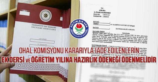 Eğitim-Bir-Sen olarak, KHK ile kamu görevinden çıkarılan ancak Olağanüstü Hal İşlemleri Komisyon kararıyla görevlerine iade edilen üyelerimiz adına açtığımız davalarda, mahkemeler, davacıların idarenin hukuka aykırı işlemi nedeniyle fiilen çalışamadığından ve idarenin davacılara vermiş olduğu zararı tazmin etmesi gerektiğinden hareketle açıkta geçen süreler için ek ders ücretleri ve öğretim yılına hazırlık ödeneğinin ödenmesi gerektiğine hükmetti.