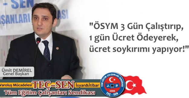 ÖSYM eğitim çalışanlarının alın terinin karşılığı olan ücreti 1 gün ile sınırlandırması “ücret soykırımı”dır. İnanıyorum ki ÖSYM bu yanlıştan en yakın zamanda dönecektir ve eğitim çalışanlarının hakkı olan ücreti ödeyecektir. Biz TEÇ-SEN olarak sınav ücretleriyle ilgili ÖSYM’ye resmi başvurumuzu yaparak bu mağduriyetlerin giderilmesini talep ettik” dedi.