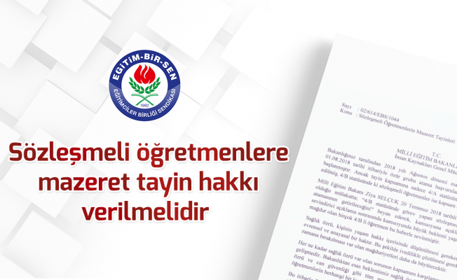 Milli Eğitim Bakanlığı’ndan, 2018 yılı Ağustos ayı mazeret tayinleri duyurusunda ivedilikle güncelleme yaparak 4/B statüsündeki sözleşmeli öğretmenlerin, sağlık özrü başta olmak üzere, 4/A statüsündeki öğretmenlere tanınan haklardan yararlandırılmasını talep ettik.