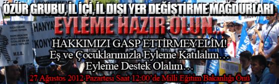 Özür grubu, il içi ve il dışı yer değiştirme mağduriyetlerinin son bulması için MEB önünde 27 Ağustos 2012 Pazartesi günü saat 12:00 ‘de Milli Eğitim Bakanlığı önünde kitlesel basın açıklaması yapacağız.