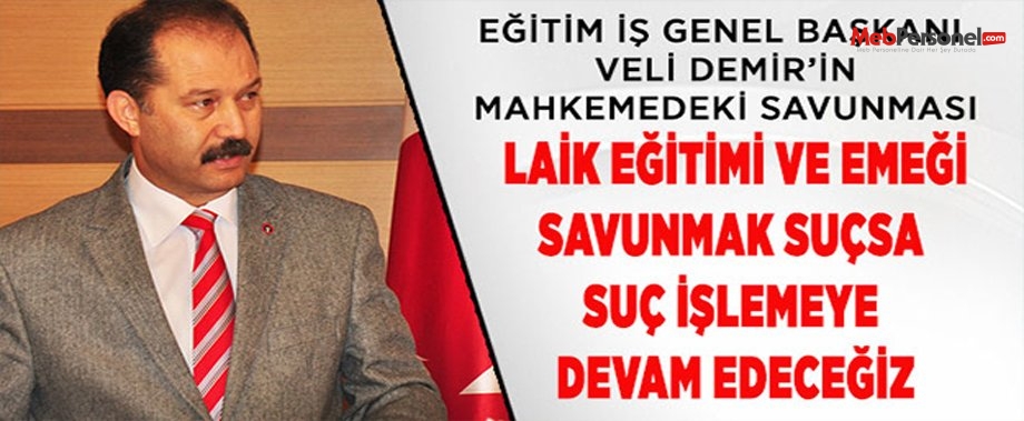 Eğitim-İş tarafından düzenlenen, Muğla Yatağan’dan başlatılan ve 20 Aralık 2014 ve Kızılay Güvenpark’ta kitlesel basın açıklaması ile son bulacak olan “Laik Eğitim ve Emeğe Saygı” yürüyüşü nedeniyle toplanma yeri olan Ankara Tandoğan meydanında polisin sert müdahalesi ve göz altıları sonucu 90 arkadaşı ile birlikte yargılandığı Ankara 25. Asliye Ceza Mahkemesi’nde görülen davada, Eğitim-İş Genel Başkanı Veli Demir, “Sayın Yargıç, mahkemeyi ve salonda bulunanları selamlıyorum” diyerek savunmasına başladı.