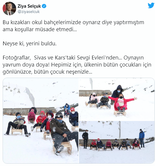 Milli Eğitim Bakanı Selçuk, sosyal medya hesabından yaptığı paylaşımda okullarda çocukların kayması için kızak yaptırdığını, ancak şartların elvermediğini belirterek, “Bu kızakları okul bahçelerimizde oynarız diye yaptırmıştım ama koşullar müsaade etmedi. Neyse ki, yerini buldu. Fotoğraflar, Sivas ve Kars’taki Sevgi Evleri’nden. Oynayın yavrum doya doya! Hepimiz için, ülkenin bütün çocukları için gönlünüzce, bütün çocuk neşenizle” ifadelerini kullandı.