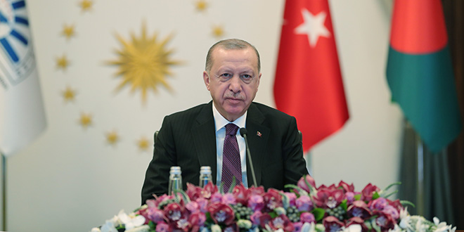 D-8 Teşkilatı 10. Zirve Toplantısı’na Cumhurbaşkanlığı Külliyesi’nden canlı bağlantıyla katılan Erdoğan, fiziken beraber olamasalar da toplantı vesilesiyle ülke liderleriyle bir araya gelmekten büyük bahtiyarlık duyduğunu dile getirdi. D-8’in kuruluşuna öncülük eden merhum Başbakan Prof. Dr. Necmettin Erbakan’ı rahmetle yad eden Erdoğan, teşkilatın bugünlere gelmesinde emeği olan tüm siyaset ve devlet adamlarına şükranlarını sundu. Zirvenin ülke, bölge ve tüm insanlık için hayırlara vesile olmasını Allah’tan niyaz eden Erdoğan, zirve toplantısıyla 4 yıla yakın bir süredir deruhte ettikleri dönem başkanlığını, dost ve kardeş Bangladeş’e devrettiklerini söyledi. Bangladeş Halk Cumhuriyeti Başbakanı Şeyh Hasina’ya başarı dileklerini sunan Erdoğan, dost ve kardeş Bangladeş’i 50. bağımsızlık yıl dönümü nedeniyle ayrıca tebrik etti.