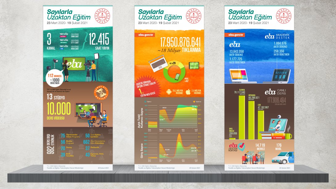 2020 – 2021 eğitim öğretim yılında 21 Eylül 2020 – 19 Şubat 2021 tarihleri arasında EBA TV İlkokul, EBA TV Ortaokul ve EBA TV Lise kanallarından toplam 6.220 saat yayın yapıldı ve bu yayınlar için Ankara ve İstanbul’da 13 ayrı stüdyoda çekimler gerçekleştirildi. 23 Mart 2020 – 19 Şubat 2021 tarihleri arasında yapılan toplam yayın saati 12.415 oldu. Uzaktan eğitim süresi boyunca toplam 10.000 ders videosu ve 982ders dışı etkinlik videosu hazırlandı.