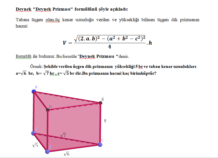Daha önce Matematikte Deynek Dörtlüsü, Deynek Altılısı, Deynek Yedilisi, Deynek Sekizlisi, Deynek Onikilisi,13 ile bölünebilme, Deynek Ondörtlüsü, Deynek Onbeşlisi, Deynek Onyedilisi, Deynek Bağıntısı, Deynek Yarıçapı 1, Deynek Yarıçapı 2,Deynek Yüksekliği,Deynek Sinüsü,Deynek Alanı 1,Deynek Alanı 2,Deynek 18 lisi,Deynek Silindiri, Deynek Konisi,Deynek Tanjantı ve Deynek Kotanjantı formüllerini bulan,Denizli Özay Gönlüm Fen Lisesi Matematik Öğretmeni Ethem Deynek, bu kez de yüksekliği verilen üçgen dik prizmanın hacim formülü olan “Deynek Prizması” formülünü buldu.Deynek bulduğu bu yeni formülle matematikte bulduğu formül sayısını 21 den 22 ye çıkarmış oldu.Oktay Sinanoğlu “İnsanın mutlu olabilmesi için çevresine katkıda bulunması gerekir” diyor. Şimdiye dek bulduğum formül sayısı 22 oldu. Elimden geldiğince matematik dünyasına katkı yapmaya gayret ediyorum. Vatanıma ve milletime bilimsel çalışmalarımla katkı sağlayabilmek benim en büyük mutluluğum.