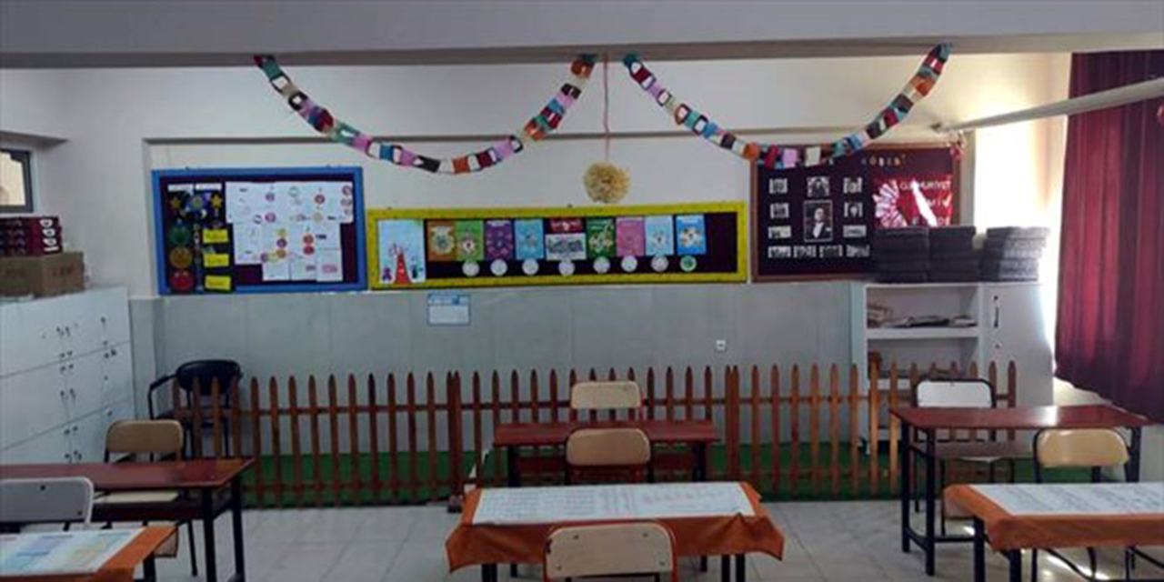 Özel solüsyonlu ilaçla dezenfekte edilen sınıflar süslendi ve öğrencilerin yeni tip koronavirüs salgını nedeniyle okul bahçesinde duracakları yerler sosyal mesafe kuralına göre işaretlendi.