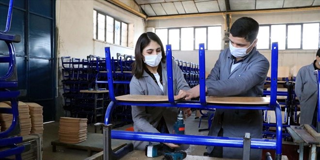 Okulların eskiyen ve yıpranan kitaplık, sıra ve masalarını onaran, ihtiyaç halinde yenilerini yapan gençler, öğrencilerin daha konforlu şekilde eğitim öğretim görmesine katkı sunuyor.