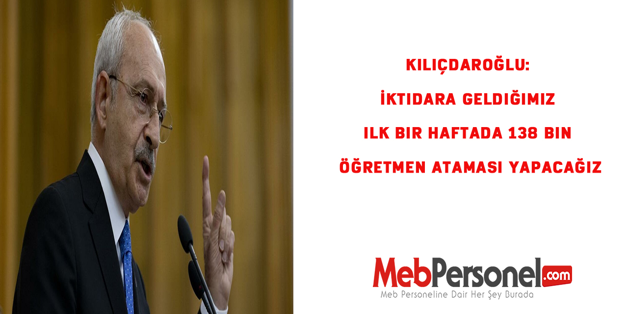 Atama bekleyen öğretmenlerin sorununu da büyük ölçüde çözeceklerini dile getiren Kılıçdaroğlu, iktidara geldikleri ilk bir haftada 138 bin öğretmen atamasını gerçekleştireceklerini ifade etti.