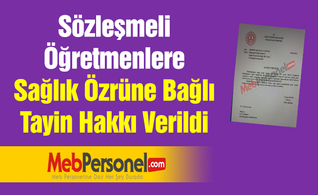 MEB Personel Genel Müdürlüğünün 6 Ağustos 2019 tarihli yazısına göre; sözleşmeli öğretmenler sağlık mazeretine bağlı iller arası yer değiştirme başvurusuna bulunabilecekler.