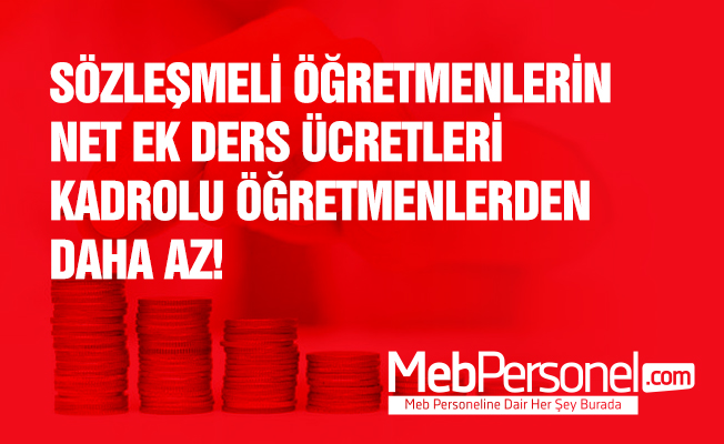 Milli Eğitim Bakanı İsmet Yılmaz’ın sözleşmeli öğretmenlerin kadrolu öğretmenlerden herhangi bir farkı olmayacağına dair açıklaması hafızalardan silinmedi. Sözleşmeli öğretmenler SGK’ya tabi olduğu için kesinti daha fazla olduğundan net ek ders ücretleri az olmaktadır. Bu konuda Milli Eğitim Bakanlığı acilen çalışma yaparak bu öğretmenlerin maddi kayıplarını gidermelidir.