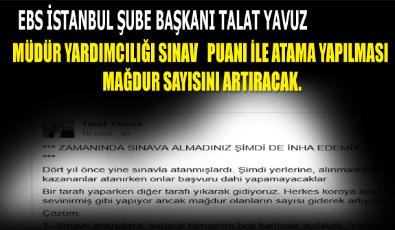 Müdür yardımcılığı sınavına açılan dava sonrası verilen yürütmeyi durdurma kararı sonrası atamaların nasıl yapılacağı konusunda Milli Eğitim Bakanlığı Müsteşarı Yusuf TEKİN’in dün yaptığı açıklama ile Müdür yardımcılığı sınav puanına göre atamaların yapılacağı ve bununla ilgili takvimi açıklamıştı. Bu açıklama ile sınava giren onbinlerce öğretmen başta olmak üzere sendika genel başkanları bu konuda teşekkürlerini ve memnuniyetlerini dile getirmişlerdi.