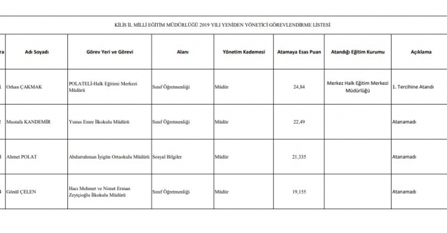 KİLİS İL MİLLİ EĞİTİM MÜDÜRLÜĞÜ TARAFINDAN 2019 YILI YENİDEN YÖNETİCİ GÖREVLENDİRME LİSTESİ AÇIKLANDI.