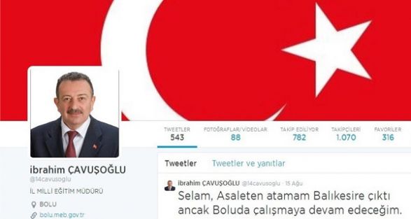 Balıkesir’e asaleten İl Milli Eğitim Müdürü olarak Atanan Bolu Milli Eğitim Müdürü İbrahim ÇAVUŞOĞLU Twiter’dan yaptığı açıklama ile herkesi şaşkına uğrattı.Bolu İl Milli Eğitim Müdürü balikesir’e il milli eğitim müdürü olarak atandı ,Balıkesir İl Miili Eğitim Müdürü Yusuf CENGİZ ise Bolu’ya asaleten atandı fakat Asaleten atanan İl Miili Eğitim Müdürleri görev yerlerine gitmeyerek şu anki görev yerlerinde kalacaklar.Yaşanan bu olay akıllara şu soruyu getirdi:”Madem her iki Milli Eğitim Müdürü görevlendirme ile kendi illerinde kalacaklardı ,neden asaleten atamaları yapıldı?Ozaman her iki müdürün asaleten atamalarının iptal edilip kendi illerinde görevlendirme yöneticiliklerine devam etmeleri gerekir.”